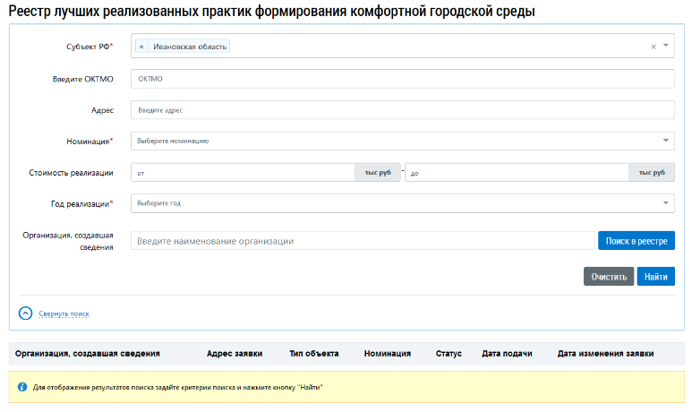 Отображается страница Реестр лучших реализованных практик формирования комфортной городской среды.