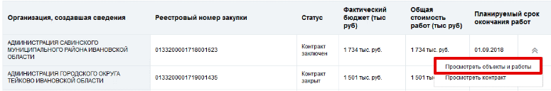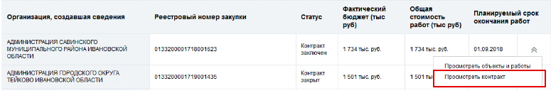 Для просмотра объектов и работы контракта нажмите на контекстное меню Посмотреть объекты и работы.