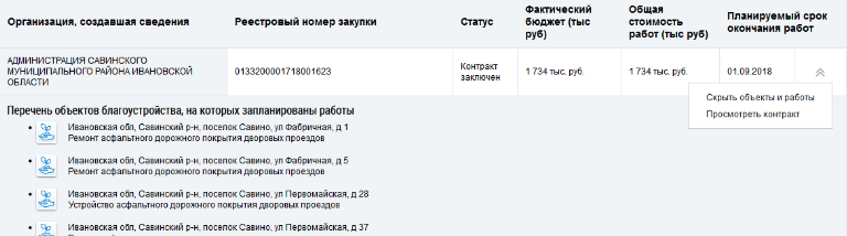 Отображается перечень объектов благоустройства, на которых запланированы работы.