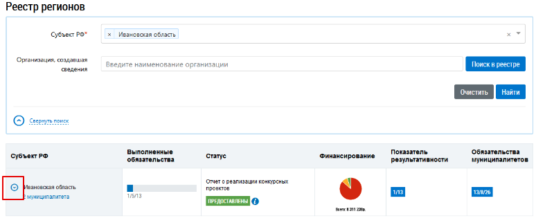 Рис. 1. Реестр регионов. Результаты поиска. Иконка перехода к просмотру прогресса выполнения обязательств субъекта РФ