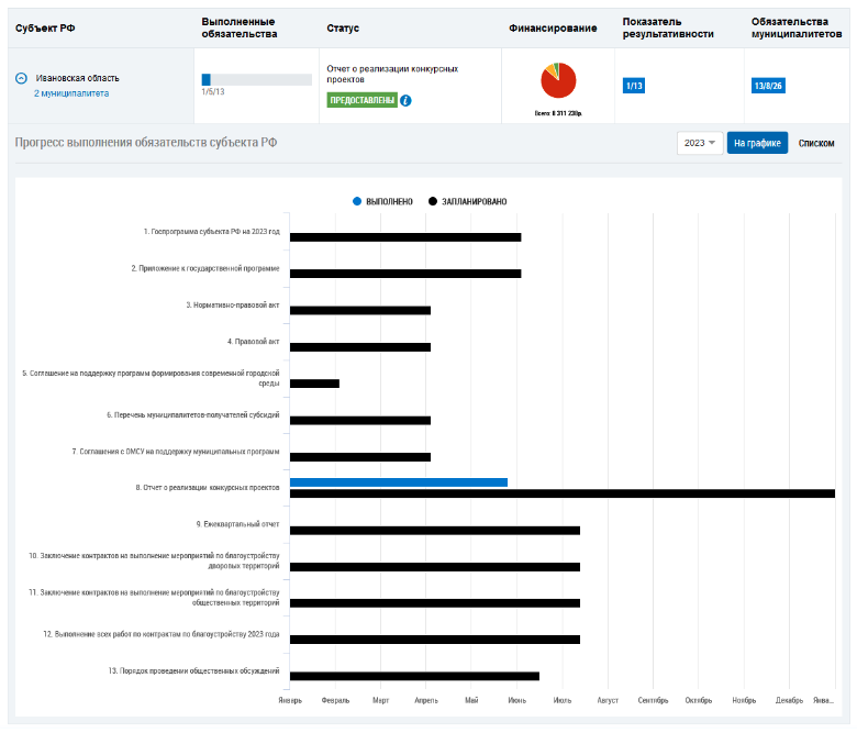 Для указанного региона будет отображена информация о прогрессе выполнения обязательств субъекта РФ. По умолчанию информацию отображена в виде графика.