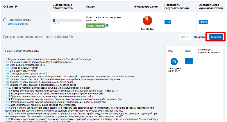 Рис. 3. Переключение вида отображения прогресса выполнения обязательств субъекта РФ на список