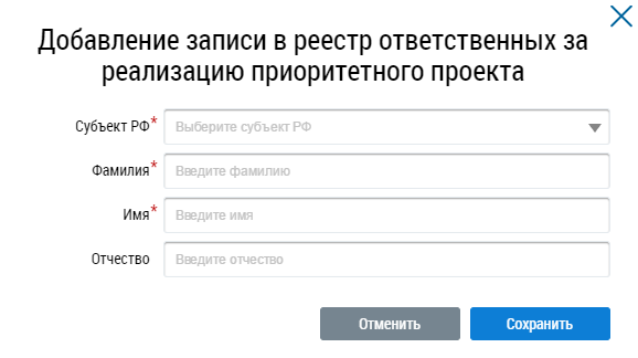 Для добавления должностного лица, ответственного за реализацию проекта, нажмите на кнопку Добавить.