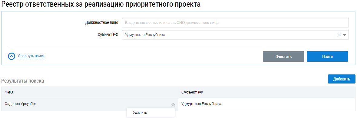 После сохранения введенные данные появятся в результатах поиска. Для удаления сохраненных данных выберите пункт контекстного меню Удалить у необходимого должностного лица.
