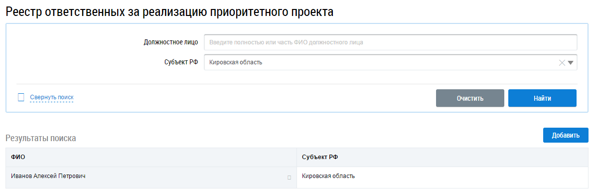 Для поиска введите необходимые значения в поля. Поиск возможен по ФИО должностного лица или по Субъекту РФ. Для заполнения поля Субъект РФ выберите необходимое значение из выпадающего списка. После задания параметров поиска нажмите на кнопку Найти, отобразится информация, соответствующая заданным параметрам. Для очистки полей поиска нажмите на кнопку Очистить.
