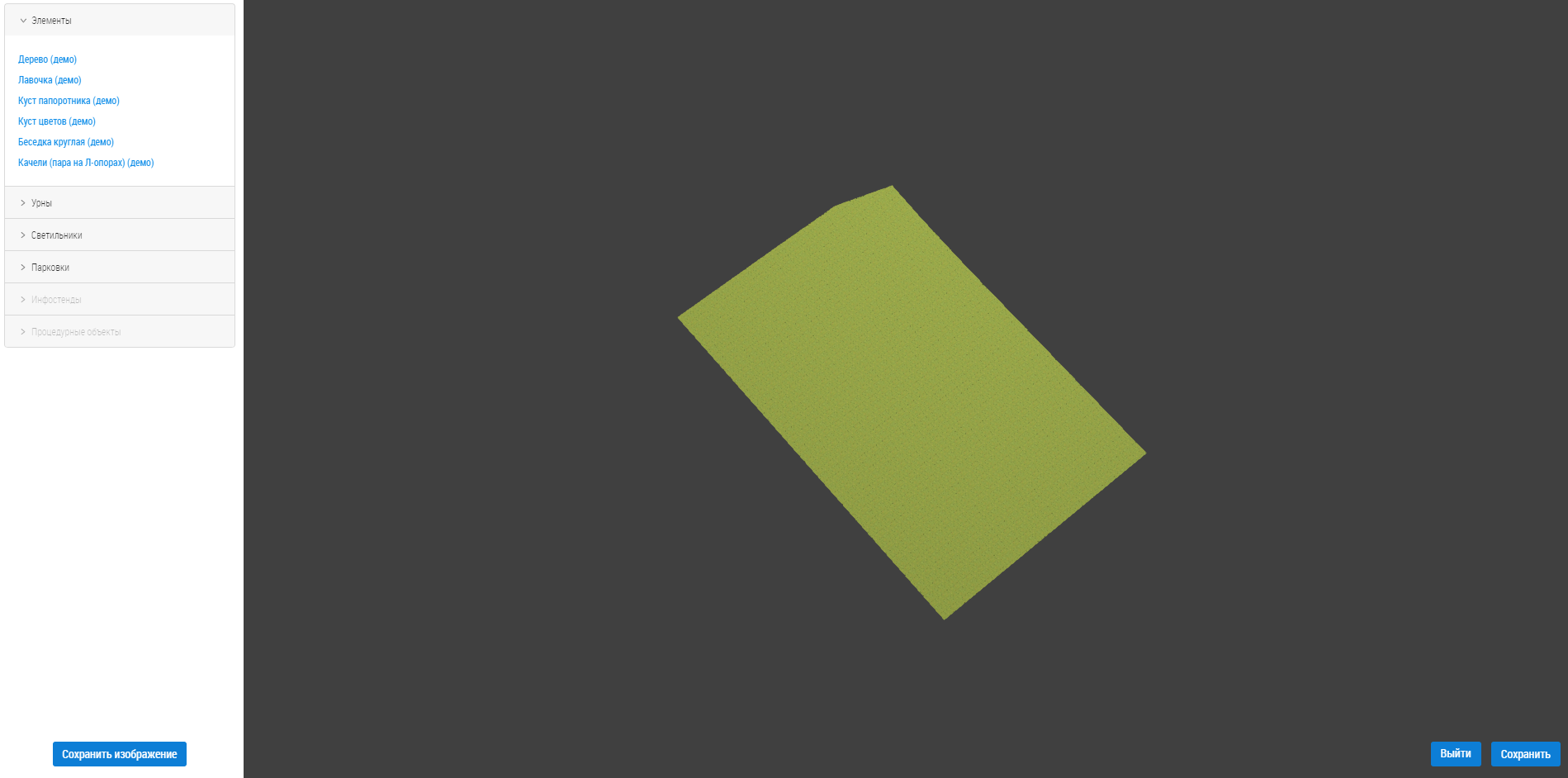 Отображается страница редактирования рабочей области, которая соответствует форме территории, созданной в п. Добавление объекта благоустройства.