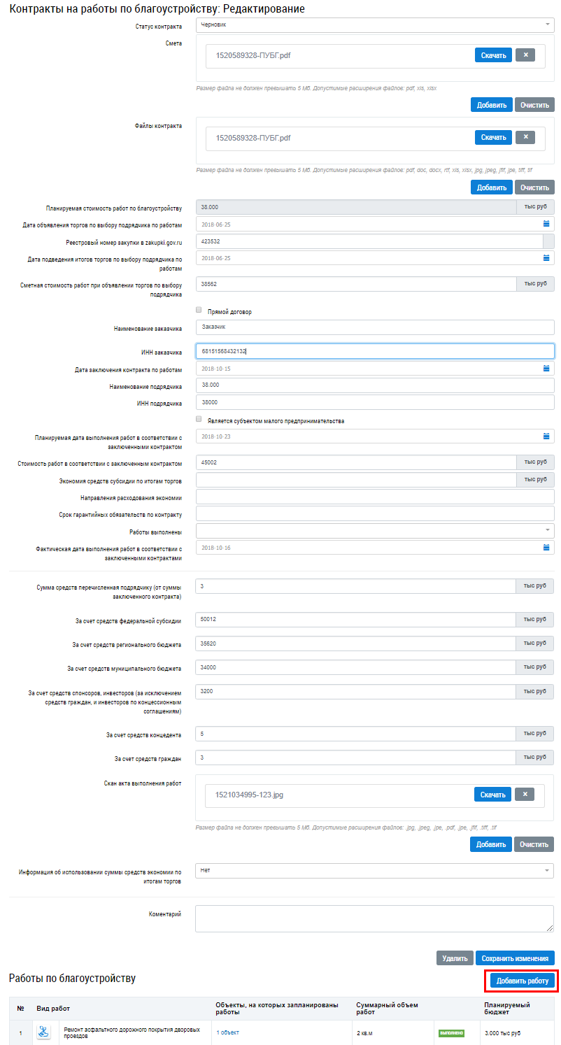 После сохранения контракта в статусе «Черновик» необходимо добавить работы по благоустройству.