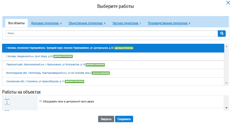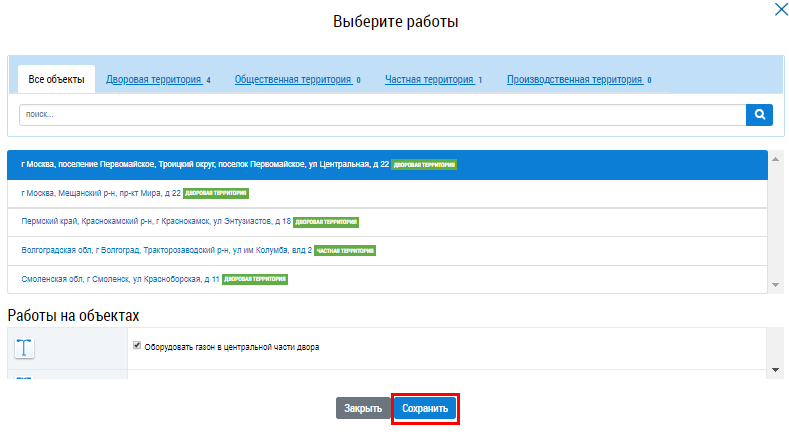 Выберите дом на вкладке Все объекты, а затем необходимые работы на вкладке Работы на объектах и нажмите на кнопку Сохранить.