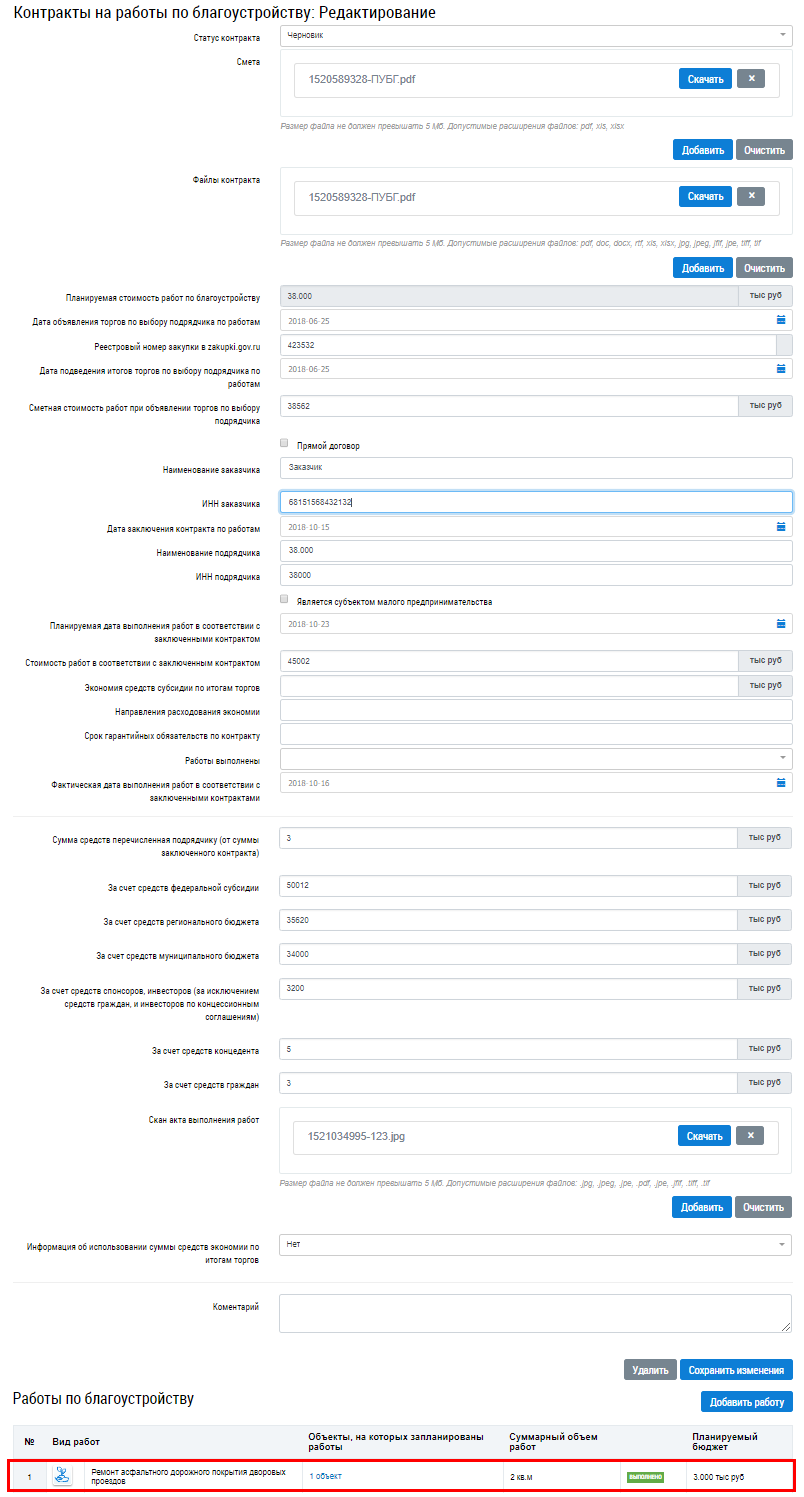 Предоставляется возможность менять статус контракта, когда размещена информация о работах по благоустройству.