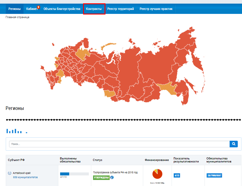 Для перехода на страницу Контракты на работы по благоустройству нажмите на вкладку Контракты.
