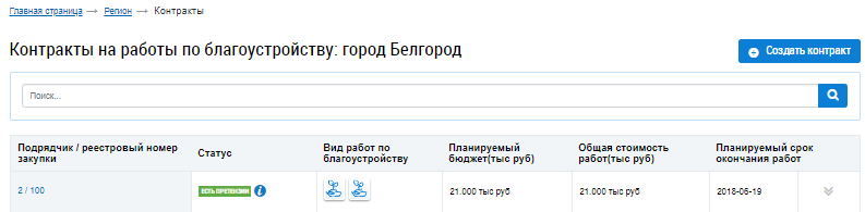 Отображается страница Контракты на работы по благоустройству.