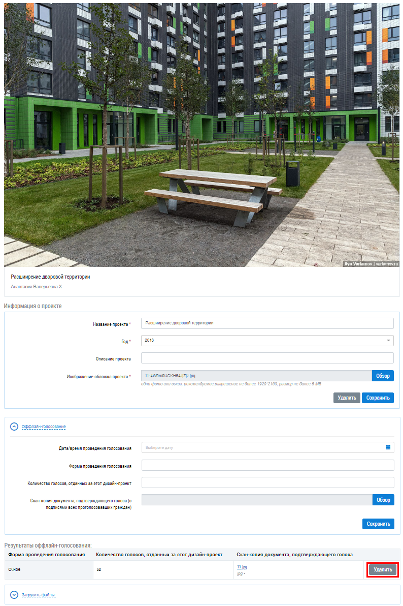 Удаление оффлайн-голосования Для удаления файла оффлайн-голосования нажмите на кнопку Удалить на странице редактирования дизайн-проекта. Рис. 1. Кнопка «Удалить»