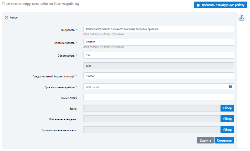 Для редактирования информации о планируемой работе по благоустройству нажмите на