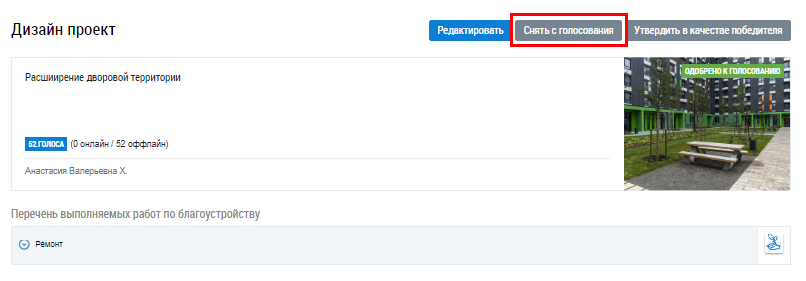 Для снятия дизайн-проекта с голосования нажмите на кнопку Снять с голосования на странице Дизайн-проекты.