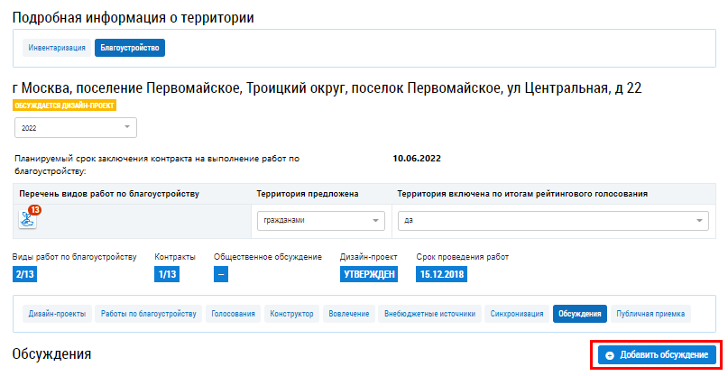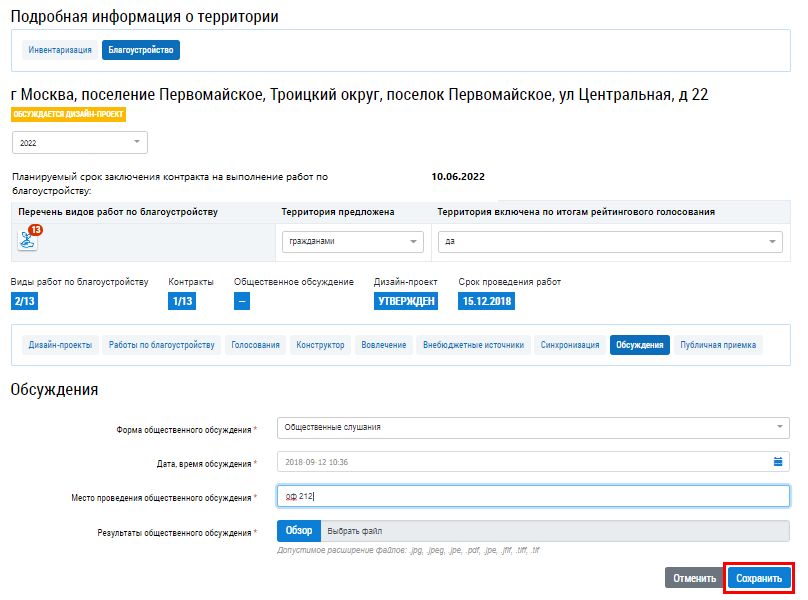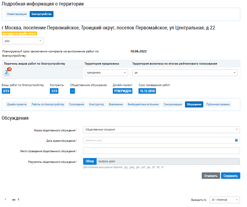 Предоставляется возможность размещать информацию о результатах общественного обсуждения территорий.