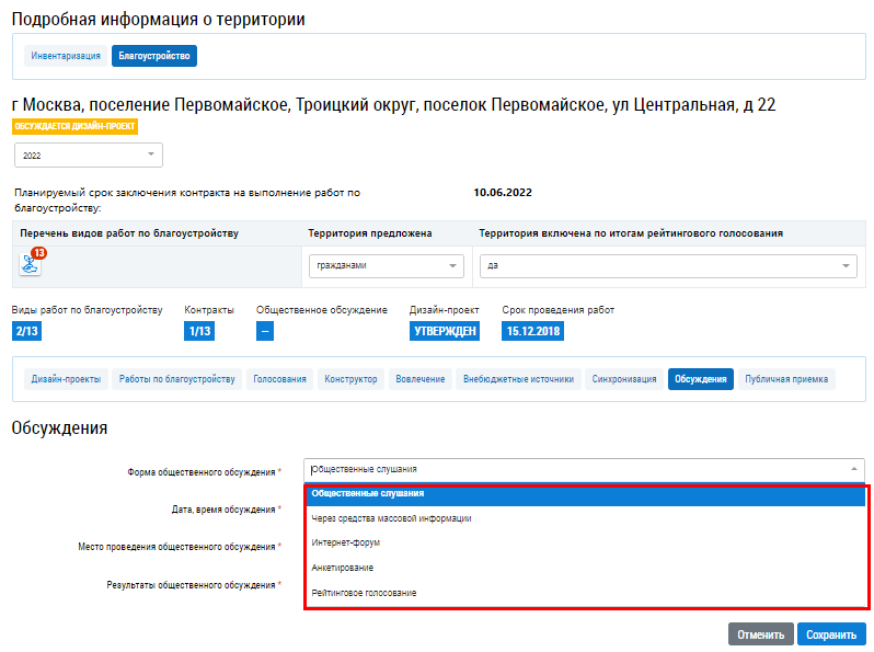 Для заполнения поля Форма общественного обсуждения выберите значение из выпадающего списка.