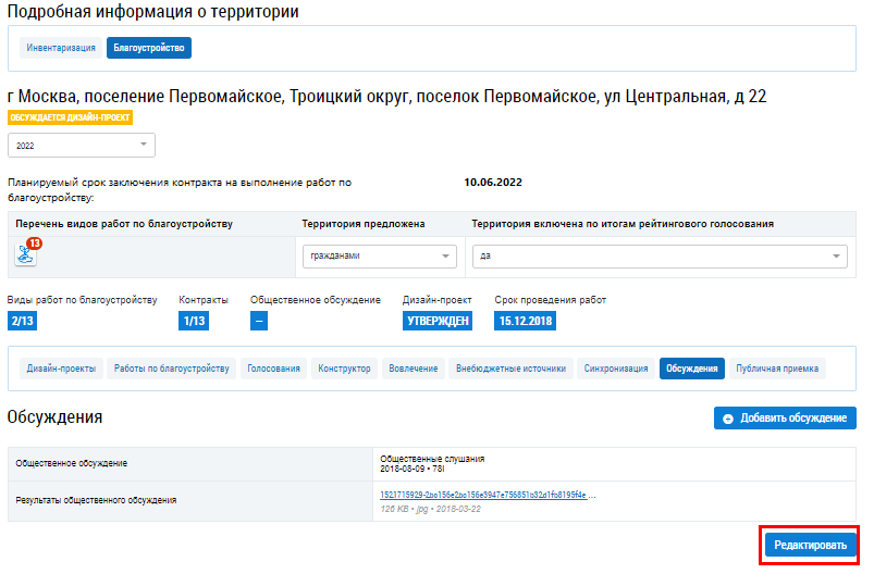 Для редактирования результатов обсуждения на вкладке Обсуждения нажмите на кнопку Редактировать.