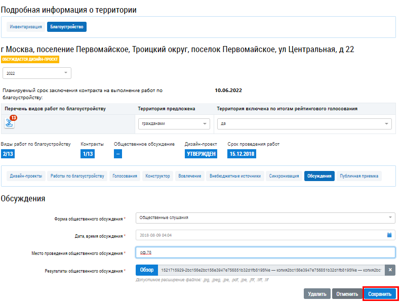 На отобразившейся странице редактирования информации о результатах обсуждения внесите необходимые изменения и нажмите на кнопку Сохранить.