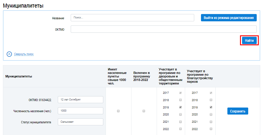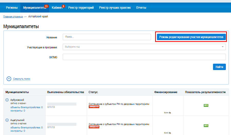 Для редактирования участия муниципалитета нажмите на кнопку Режим редактирования участия муниципалитетов.