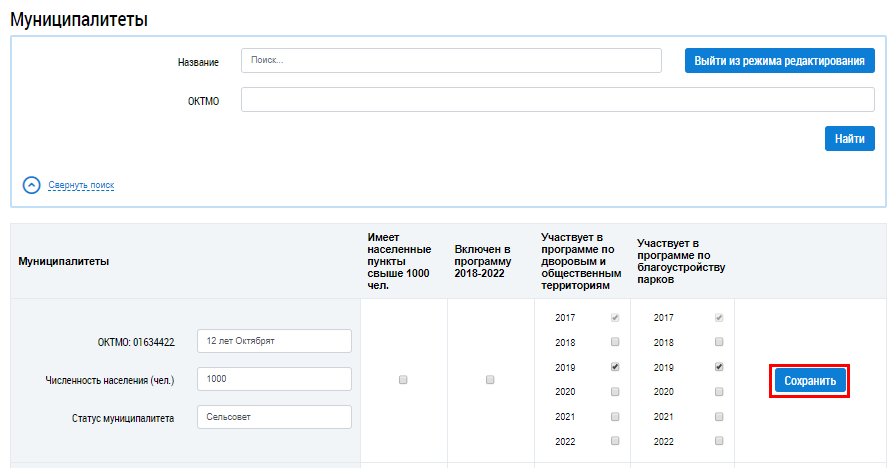 Внесите необходимые изменения и нажмите на кнопку Сохранить. Информации об участии муниципалитетов скорректирована.