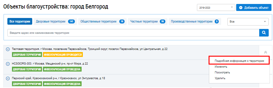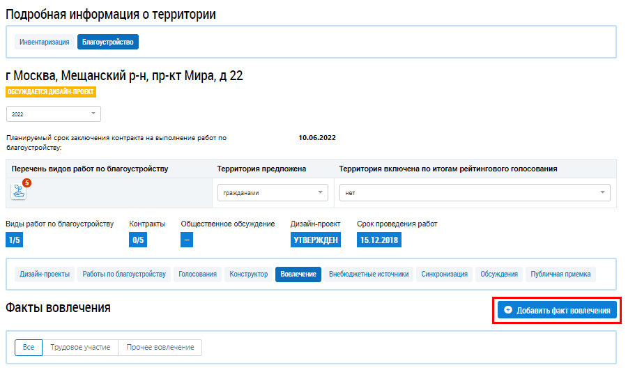 Для перехода на вкладку Факты вовлечения выберите пункт контекстного Подробная информация о территории.