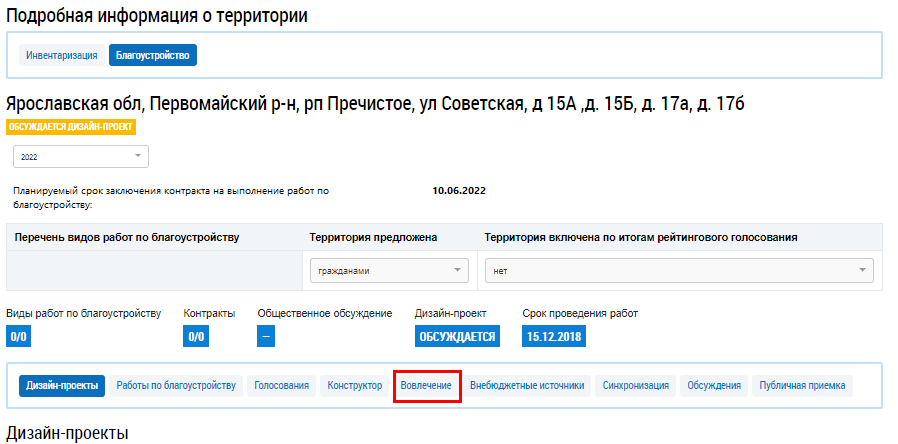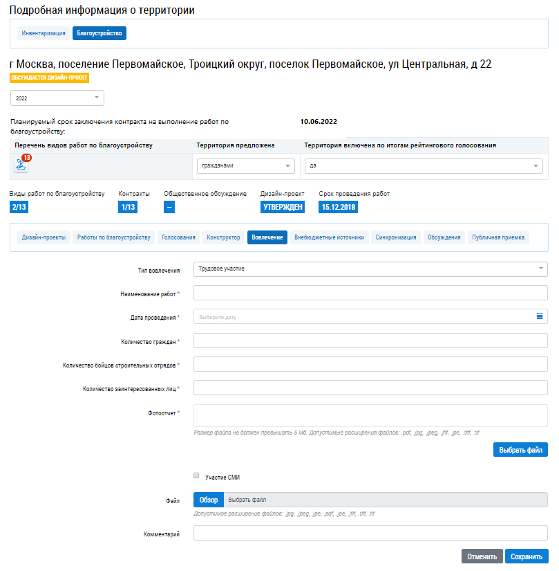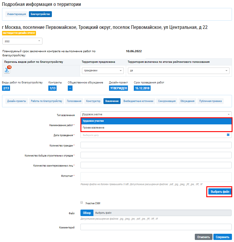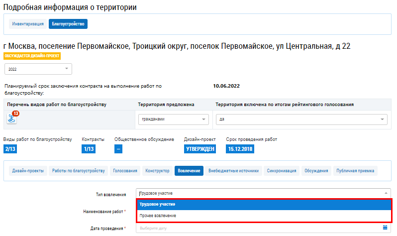 Предоставляется возможность внести информацию по типам вовлечения граждан в проведение благоустройства по объекту.
