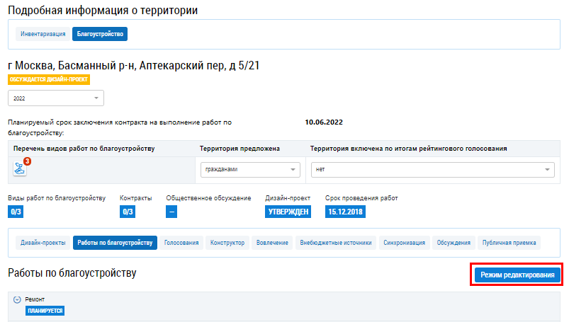Рис. 3. Вкладка «Работы по благоустройству». Кнопка «Режим редактирования»