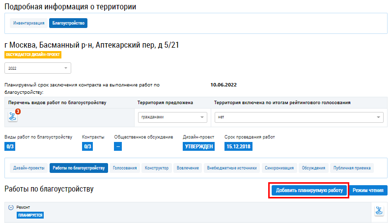 Рис. 4. Вкладка «Работы по благоустройству». Кнопка «Добавить планируемую работу»
