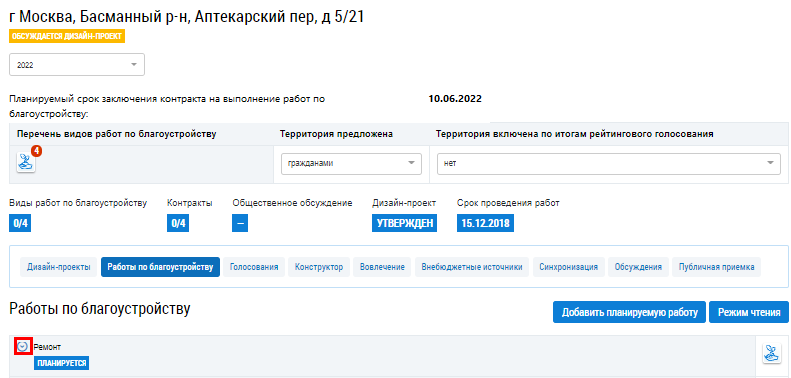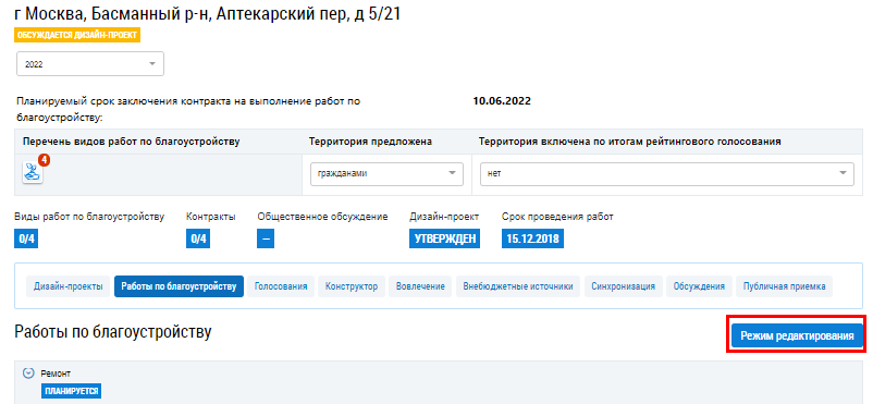 Для редактирования работы по благоустройству на вкладке Работы по благоустройству нажмите на кнопку Режим редактирования.