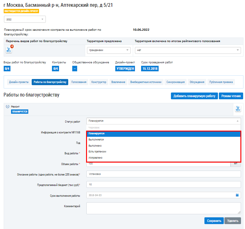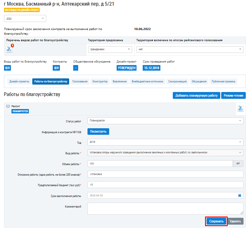 Редактирование работы по благоустройству