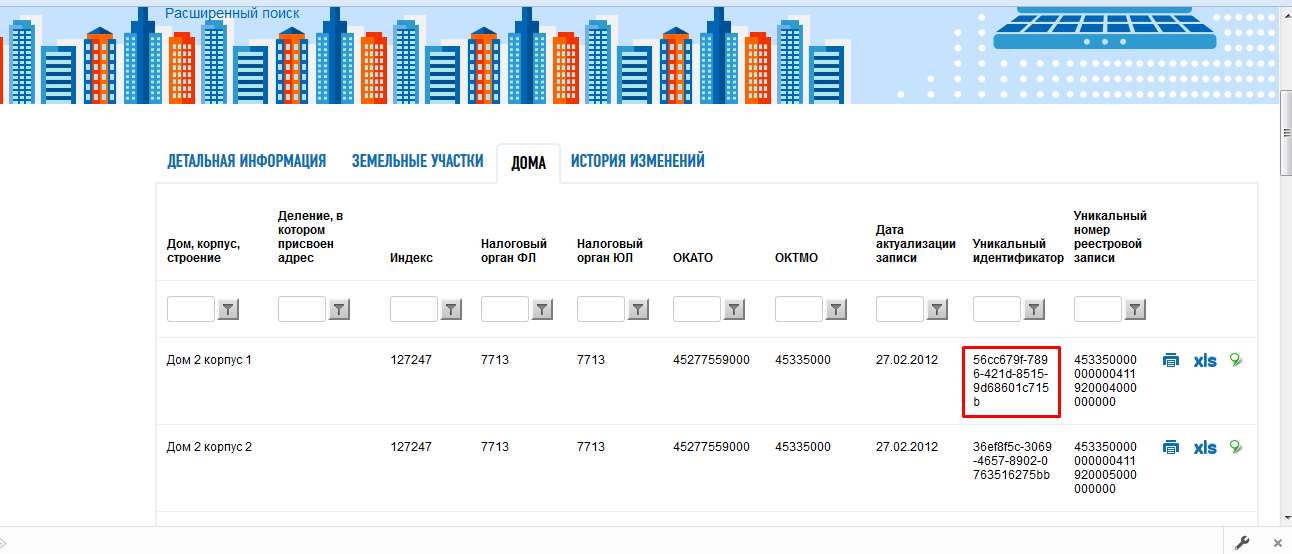Отображаются результаты поиска, перейдите на вкладку Дома и выберите необходимый дом. В столбце Уникальный идентификатор находится искомый ФИАС-код дома.