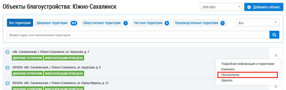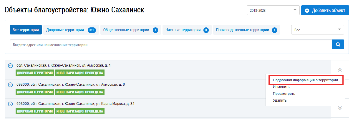 Для просмотра информации об объекте благоустройства нажмите на кнопку «
