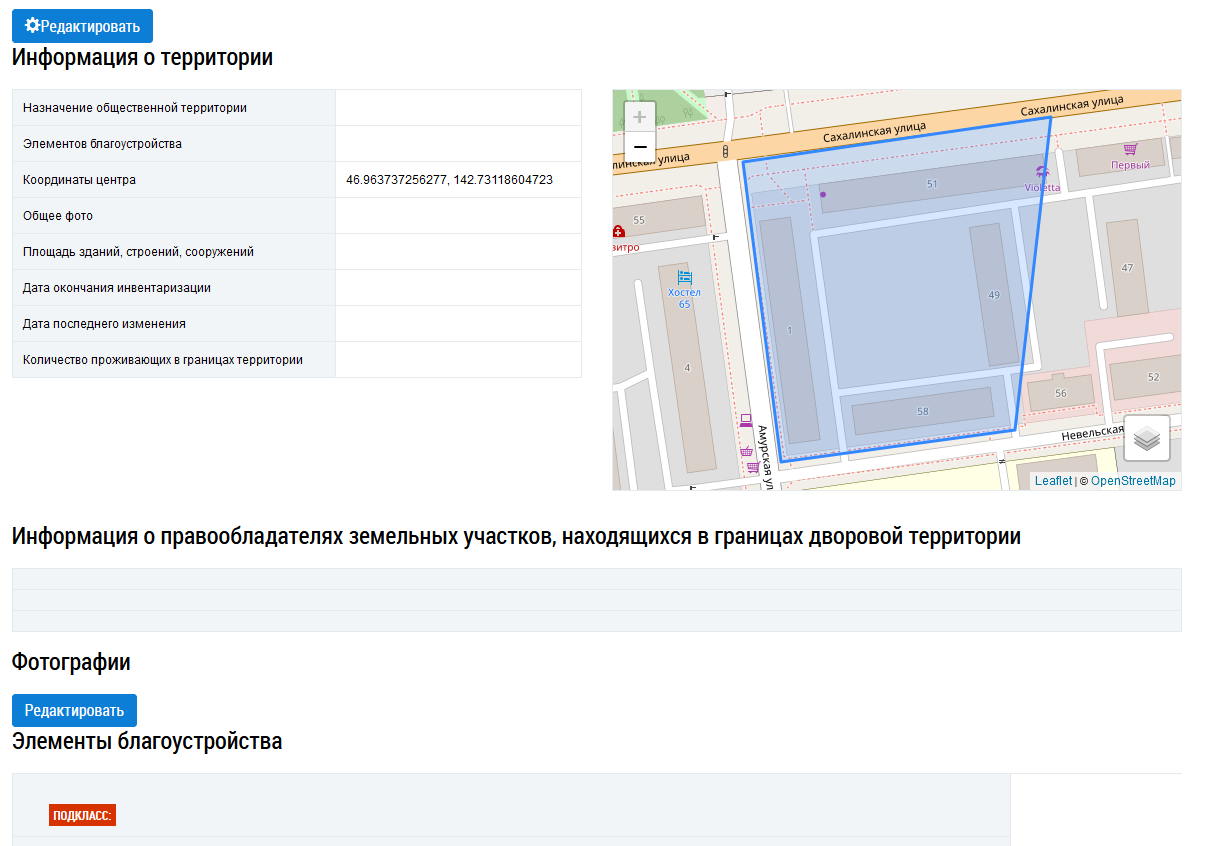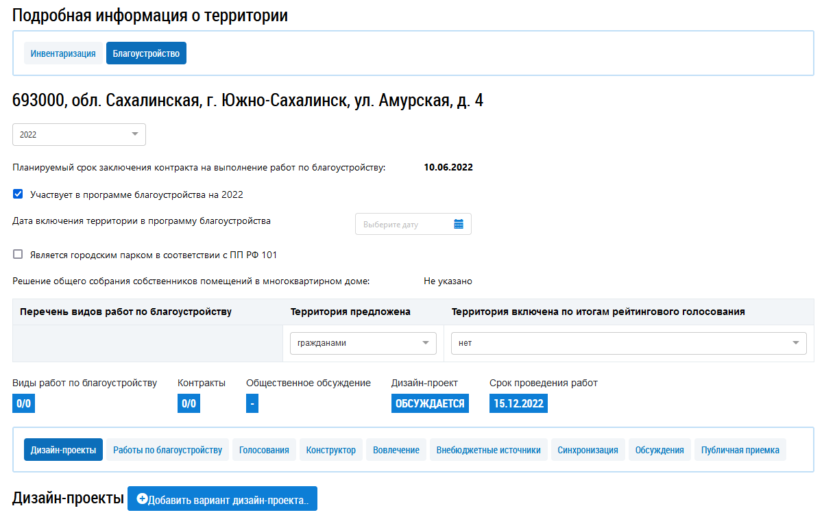 Отображается страница Подробная информация о территории на вкладке Благоустройство.