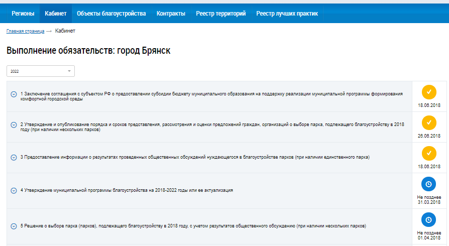 Для муниципалитетов, участвующих в программе в 2018-2022 гг., также доступны действия с обязательствами на вкладке Кабинет.