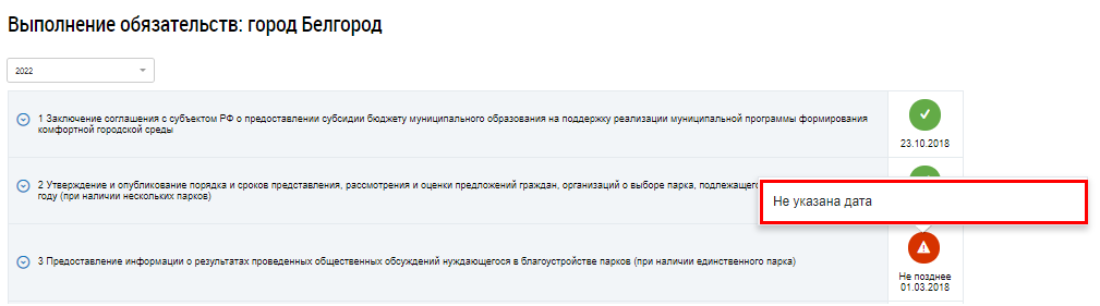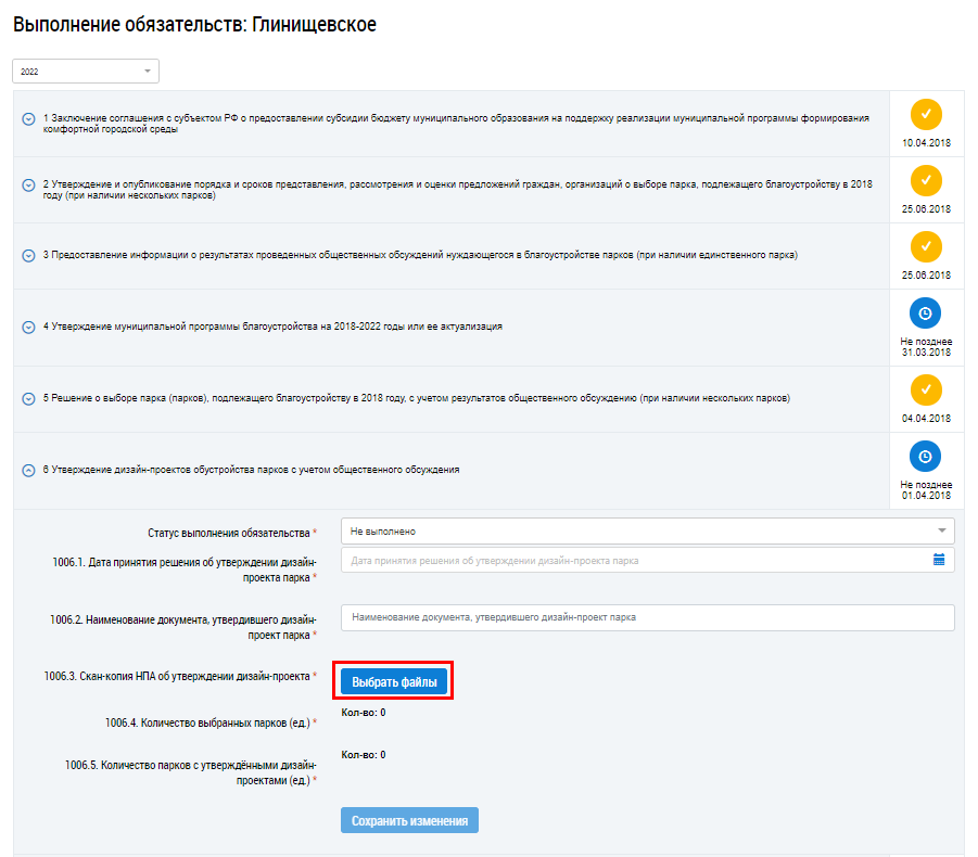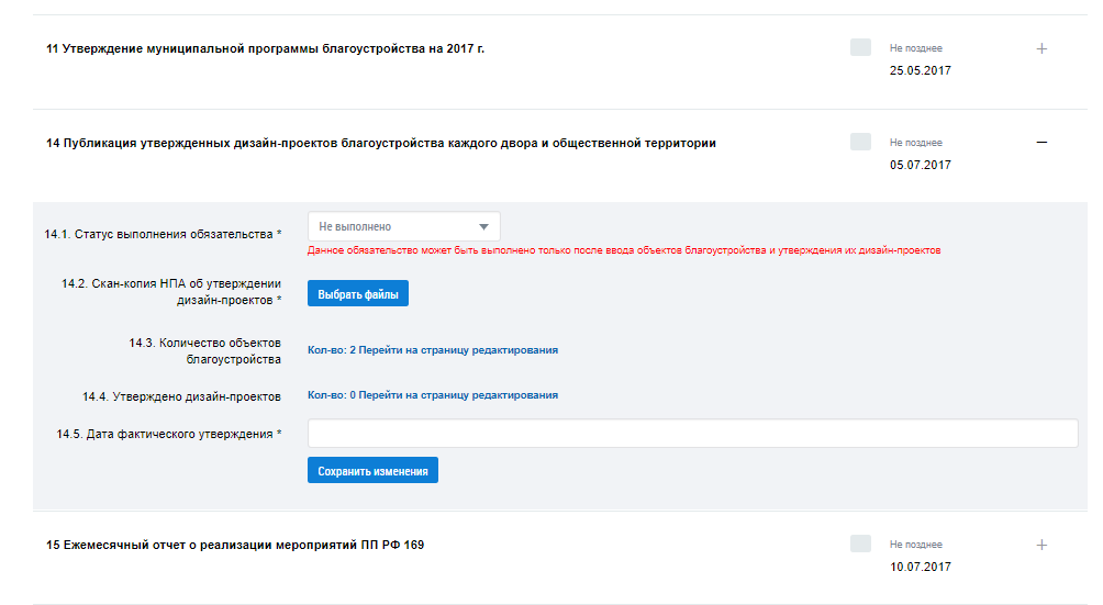 Орган местного управления, уполномоченный на ведение программы «Формирование современной городской среды», формирует отчет об исполнении обязательства, например, одно из первых обязательств на странице Выполнение обязательств – создание общественной комиссии для оценки обсуждения проектов и предложений по благоустройству.