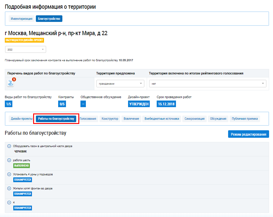 При утверждении дизайн-проекта работы благоустройства из дизайн-проекта автоматически переносятся в список работ по объекту благоустройства.