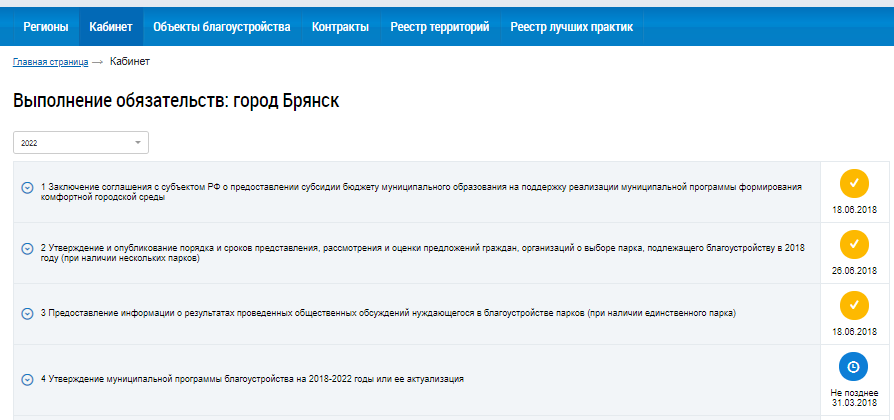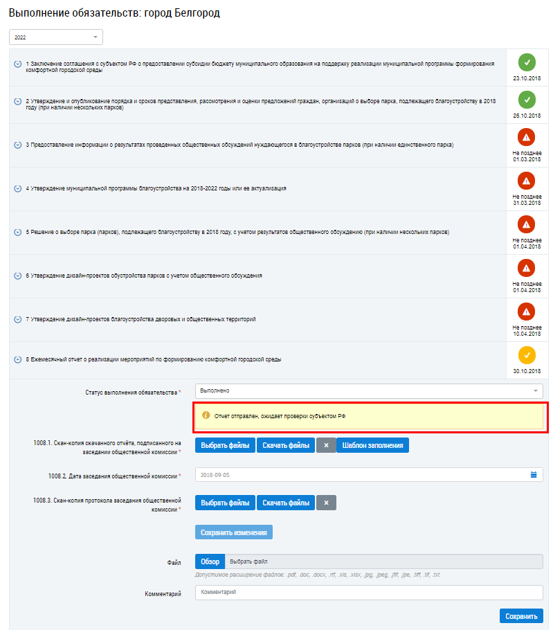 Отчет о выполнении обязательства направляется в личный кабинет Органа власти субъекта РФ, уполномоченного на ведение программы «Формирование современной городской среды», где рассматривается направленный отчет, и Орган власти субъекта РФ принимает или не принимает обязательство. Подробное описание дано в п. Принятие отчетов муниципалитетов.