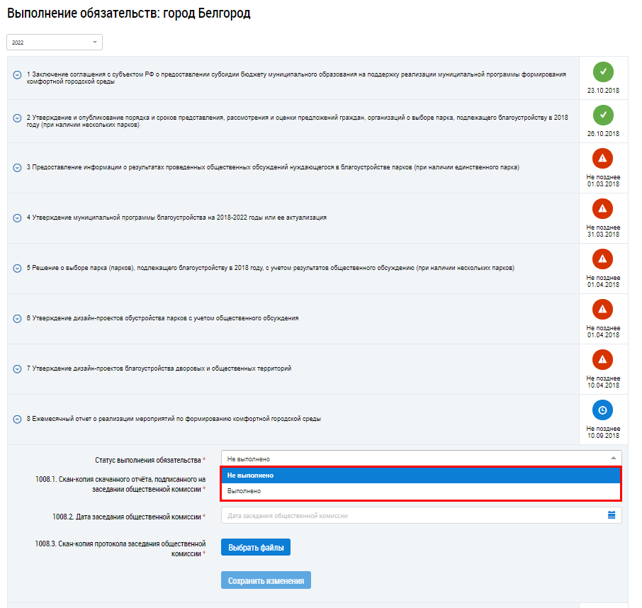 Для заполнения поля Статус выполнения обязательства выберите значение из выпадающего списка: