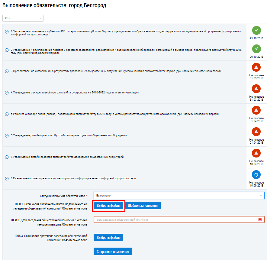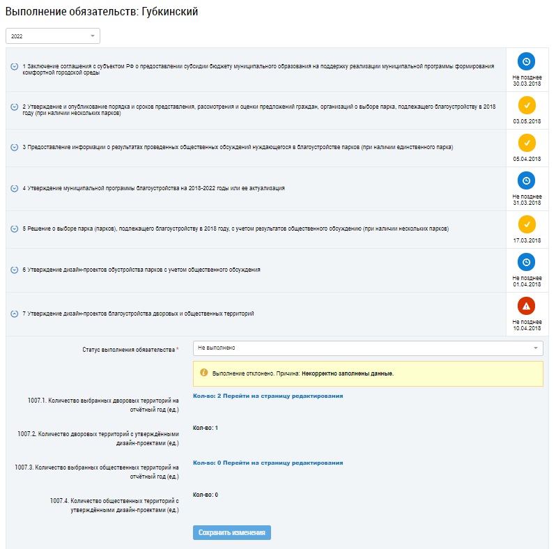 Если отчет отклонен Органом власти субъекта РФ, уполномоченного на ведение программы «Формирование современной городской среды», отображается следующая страница с отклоненным выполнением обязательства.