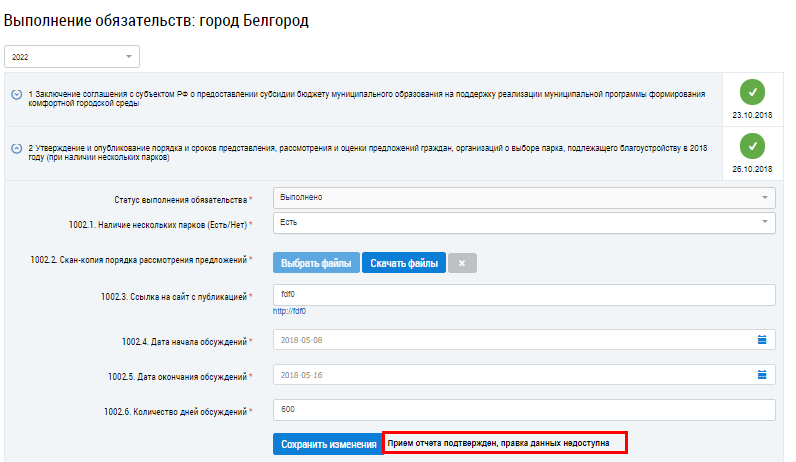 После принятия отчета Органом власти субъекта РФ, уполномоченным на ведение программы «Формирование современной городской среды», отчет становится подтвержденным, правка данных об исполнении обязательства недоступна.