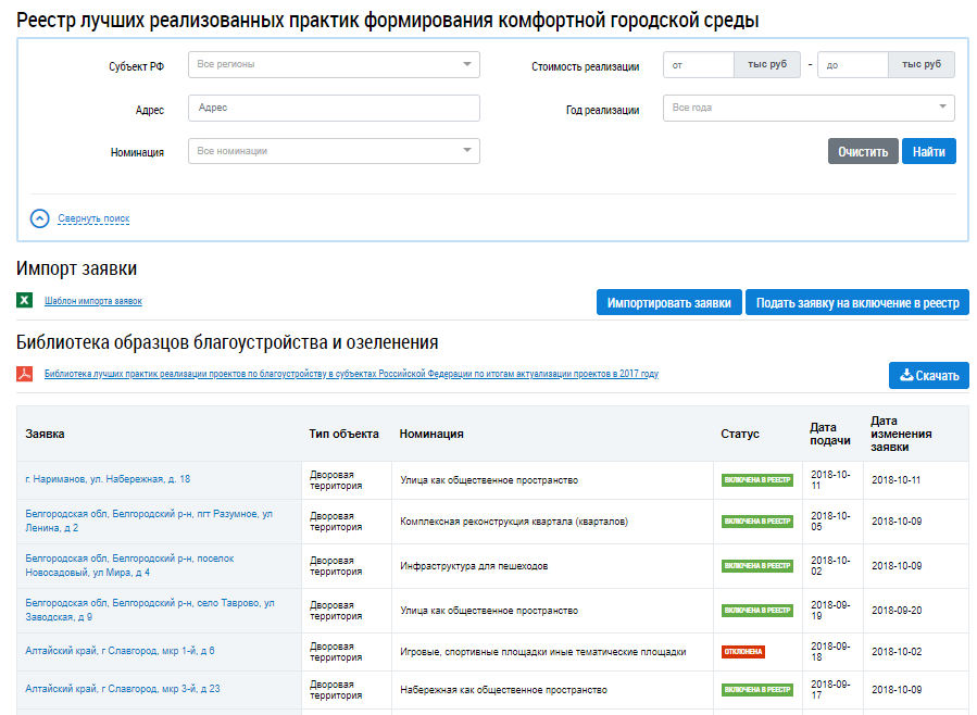 Отображается страница Реестр лучших реализованных практик формирования комфортной городской среды.
