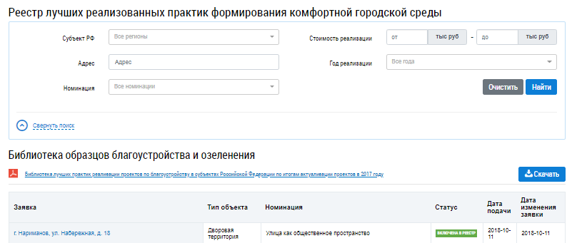 Отображается страница Реестр лучших реализованных практик формирования комфортной городской среды.