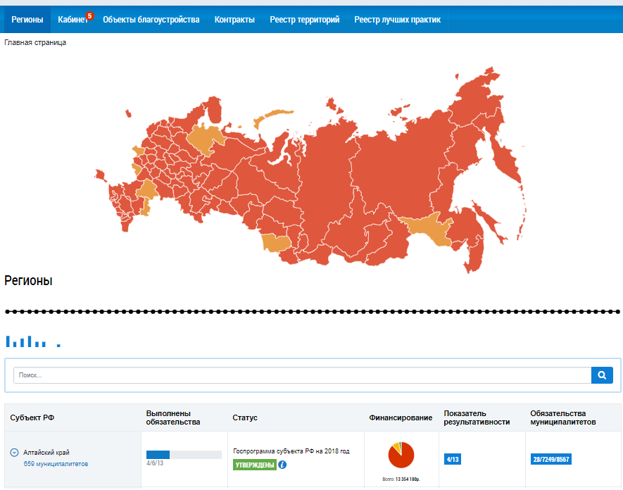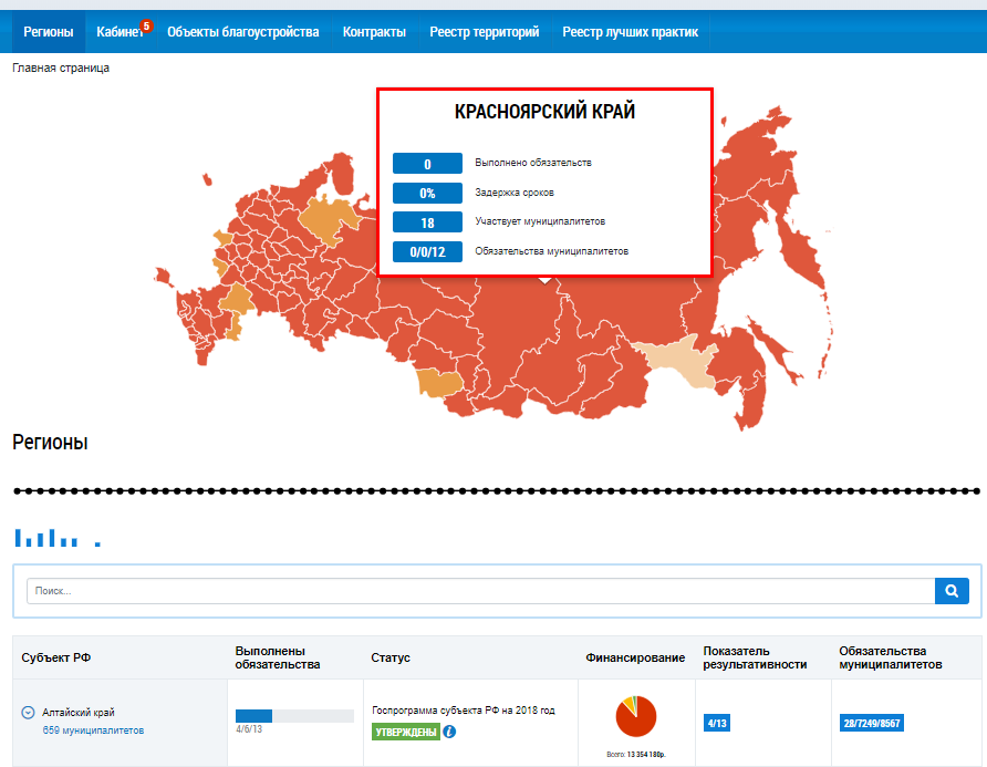 Отображается главная страница сайта, состоящая из вкладок: Регионы, Кабинет, Объекты благоустройства, Контракты, Реестр территорий, Реестр лучших практик.
