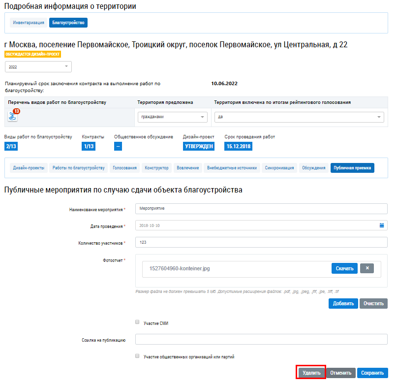 Удаление мероприятия Для удаления мероприятия перейдите в режим редактирования и нажмите на кнопку Удалить. Рис. 1. Страница редактирования информации о мероприятии. Кнопка «Удалить» Подтвердите действие.