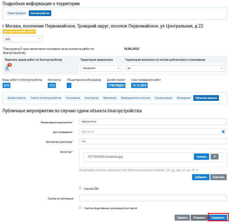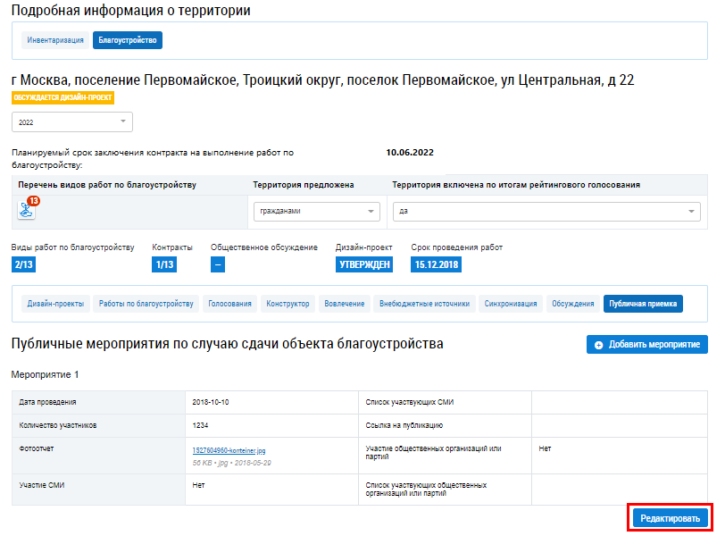 Для редактирования информации о мероприятии нажмите на гиперссылку Редактировать на вкладке Публичная приемка.