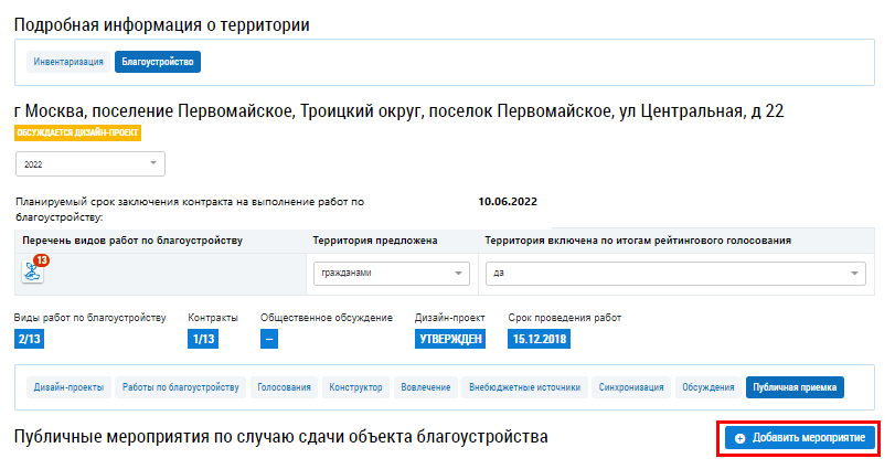Перейдите на вкладку Публичная приемка. Нажмите на кнопку Добавить мероприятие.