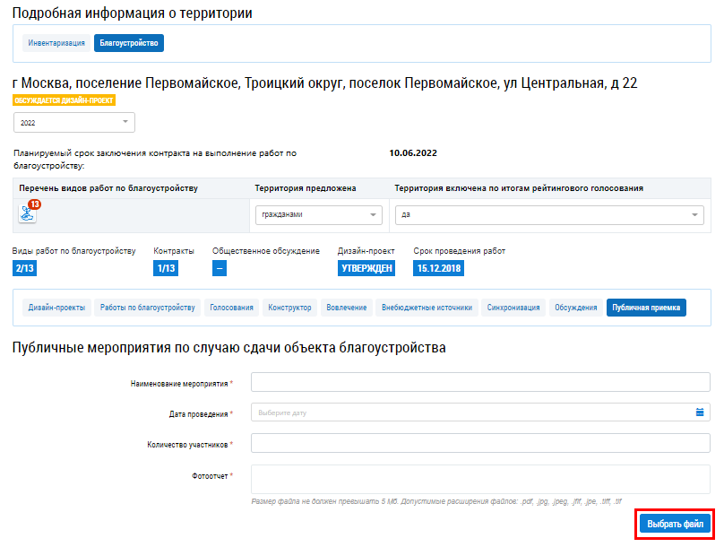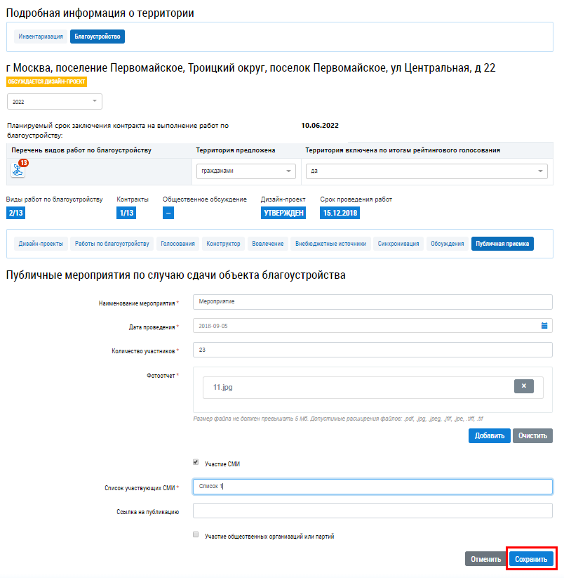 Предоставляется возможность разместить информацию о публичных мероприятиях по случаю сдачи объекта благоустройства и планируемых мероприятиях.