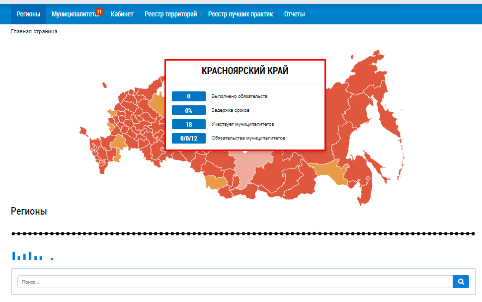 Блок Регионы содержит шкалу с отображением по регионам общего количества обязательств и выполненных обязательств. На шкале горизонтальной линией отображен целевой уровень выполнения обязательств. Под чертой располагаются вертикальные индикаторы степени выполнения обязательств регионами. При наведении курсора мыши на индикатор региона отображается подсказка.