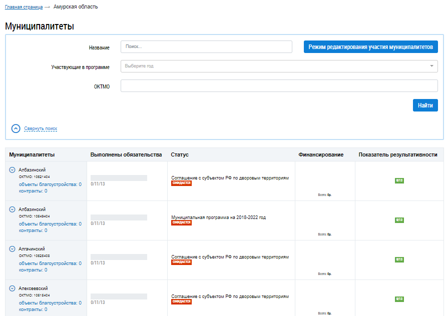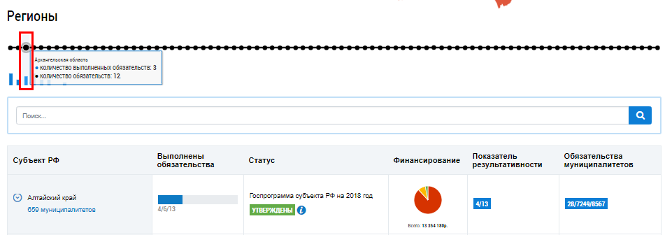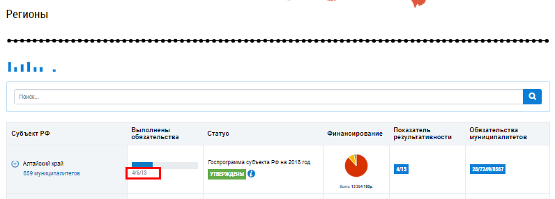 Столбец Обязательства муниципалитетов содержит количество выполненных обязательств муниципалитетами данного субъекта, количество актуальных на текущий момент обязательств муниципалитетов данного субъекта, общее количество обязательств муниципалитетов данного субъекта.