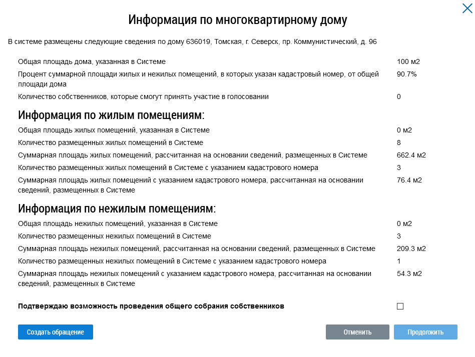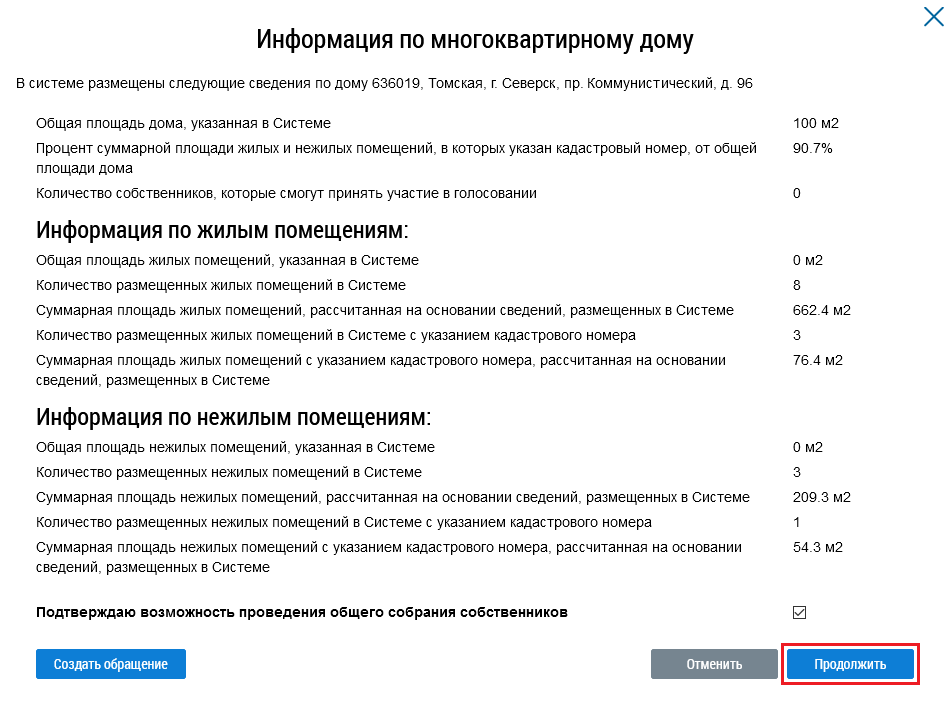 Если все данные верны, установите флажок в поле Подтверждаю возможность проведения общего собрания собственников и нажмите на кнопку Продолжить.